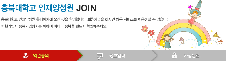 제 1 장 총 칙 제 1 조 (목 적) 본 약관은 충북대학교 인재양성원(이하 인재양성원)의 충북대학교 인재양성원 홈페이지(이하 "홈페이지")가 제공하는 모든 서비스(이하 "서비스")의 이용조건 및 절차, 이용자와 홈페이지의 권리, 의무, 책임사항과 기타 필요한 사항을 규정함을 목적으로 합니다. 제 2 조 (약관의 효력과 변경) 1. 홈페이지는 귀하가 본 약관 내용에 동의하는 경우, 홈페이지의 서비스 제공 행위 및 귀하의 서비스 사용 행위에 본 약관이 우선적으로 적용됩니다. 2. 인재양성원이 약관을 개정할 경우에는 적용일자 및 개정사유를 명시하여 현행 약관과 함께 사이트의 초기화면에 그 적용일자 7일 이전부터 적용일자 전일까지 공지합니다. 그 기간 안에 회원의 전자메일을 통해 또 한번 공지합니다. 3. 제2 항의 방법으로 변경 고지된 약관은 기존의 회원에게도 유효하게 효력을 발생합니다. 4. 회원이 변경된 약관에 동의하지 않는 경우, 본인의 회원등록을 취소(회원탈퇴)할 수 있으며 계속 사용의 경우는 약관 변경에 대한 동의로 간주됩니다. 5. 본 약관에 명시되지 않은 사항은 전기통신기본법, 전기통신사업법, 정보통신윤리위원회 심의규정, 정보통신 윤리강령, 프로그램보호법 및 기타 관련 법령의 규정에 의합니다. 제 3 조 (용어의 정의) 본 약관에서 사용하는 용어의 정의는 다음과 같습니다. 1. 이용자 : 본 약관에 따라 홈페이지가 제공하는 서비스를 받는 자. 2. 가입 : 홈페이지가 제공하는 신청서 양식에 해당 정보를 기입하고, 본 약관에 동의하여 서비스 이용계약을 완료시키는 행위 3. 회원 : 홈페이지에 개인 정보를 제공하여 회원 등록을 한 자로서 홈페이지가 제공하는 서비스를 이용할 수 있는 자 4. 아이디 : 이용고객의 식별과 이용자가 서비스 이용을 위하여 이용자가 선정하고 당 사이트가 부여하는 문자와 숫자의 조합 5. 비밀번호 : 이용자와 회원ID가 일치하는지를 확인하고 통신상의 자신의 비밀보호를 위하여 이용자 자신이 선정한 문자와 숫자의 조합 6. 탈퇴 : 회원이 이용계약을 종료시키는 행위 제 2 장 서비스 제공 및 이용 제 4 조 (이용계약의 성립 및 탈퇴) 1. 이용계약은 신청자가 온라인으로 홈페이지에서 제공하는 소정의 가입신청 양식에서 요구하는 사항을 기록하여 가입을 완료하는 것으로 성립됩니다. 2. 홈페이지는 다음 각 호에 해당하는 이용계약에 대하여는 가입을 취소할 수 있습니다. 1) 다른 사람의 명의를 사용하여 신청하였을 때 2) 이용계약 신청서의 내용을 허위로 기재하였거나 신청하였을 때 3) 다른 사람의 홈페이지 서비스 이용을 방해하거나 그 정보를 도용하는 등의 행위를 하였을 때 4) 홈페이지를 이용하여 법령과 본 약관이 금지하는 행위를 하는 경우 5) 기타 홈페이지가 정한 이용신청요건이 미비 되었을 때 제 5 조 (회원정보 사용에 대한 동의) 1. 회원의 개인정보는 공공기관의 개인정보보호에 관한 법률에 의해 보호됩니다. 2. 홈페이지의 회원 정보는 다음과 같이 사용, 관리, 보호됩니다. 1) 개인정보의 사용 : 홈페이지는 서비스 제공과 관련해서 수집된 회원의 신상정보를 본인의 승낙 없이 제3자에게 누설, 배포하지 않습니다. 단, 전기통신기본법 등 법률의 규정에 의해 국가기관의 요구가 있는 경우, 범죄에 대한 수사상의 목적이 있거나 정보통신윤리위원회의 요청이 있는 경우 또는 기타 관계법령에서 정한 절차에 따른 요청이 있는 경우, 귀하가 홈페이지에 제공한 개인정보를 스스로 공개한 경우에는 그러하지 않습니다. 2) 개인정보의 관리 : 귀하는 개인정보의 보호 및 관리를 위하여 서비스의 개인정보관리에서 수시로 귀하의 개인정보를 수정/삭제할 수 있습니다. 3) 개인정보의 보호 : 귀하의 개인정보는 오직 귀하만이 열람/수정/삭제 할 수 있으며, 이는 전적으로 귀하의 ID와 비밀번호에 의해 관리되고 있습니다. 따라서 타인에게 본인의 ID와 비밀번호를 알려주어서는 안 되며, 작업 종료 시에는 반드시 로그아웃 해주시기 바랍니다. 3. 회원이 본 약관에 따라 이용신청을 하는 것은, 홈페이지가 신청서에 기재된 회원정보를 수집, 이용하는 것에 동의하는 것으로 간주됩니다. 제 6 조 (사용자의 정보 보안) 1. 가입 신청자가 홈페이지 서비스 가입 절차를 완료하는 순간부터 귀하는 입력한 정보의 비밀을 유지할 책임이 있으며, 회원의 ID와 비밀번호를 사용하여 발생하는 모든 결과에 대한 책임은 회원 본인에게 있습니다. 2. ID와 비밀번호에 관한 모든 관리의 책임은 회원에게 있으며, 회원의 ID나 비밀번호가 부정하게 사용되었다는 사실을 발견한 경우에는 즉시 홈페이지에 신고하여야 합니다. 신고를 하지 않음으로 인한 모든 책임은 회원 본인에게 있습니다. 3. 이용자는 홈페이지 서비스의 사용 종료 시마다 정확히 접속을 종료해야 하며, 정확히 종료하지 아니함으로써 제3자가 귀하에 관한 정보를 이용하게 되는 등의 결과로 인해 발생하는 손해 및 손실에 대하여 홈페이지는 책임을 부담하지 아니합니다. 제 7 조 (서비스의 중지) 1. 홈페이지는 이용자가 본 약관의 내용에 위배되는 행동을 한 경우, 임의로 서비스 사용을 제한 및 중지할 수 있습니